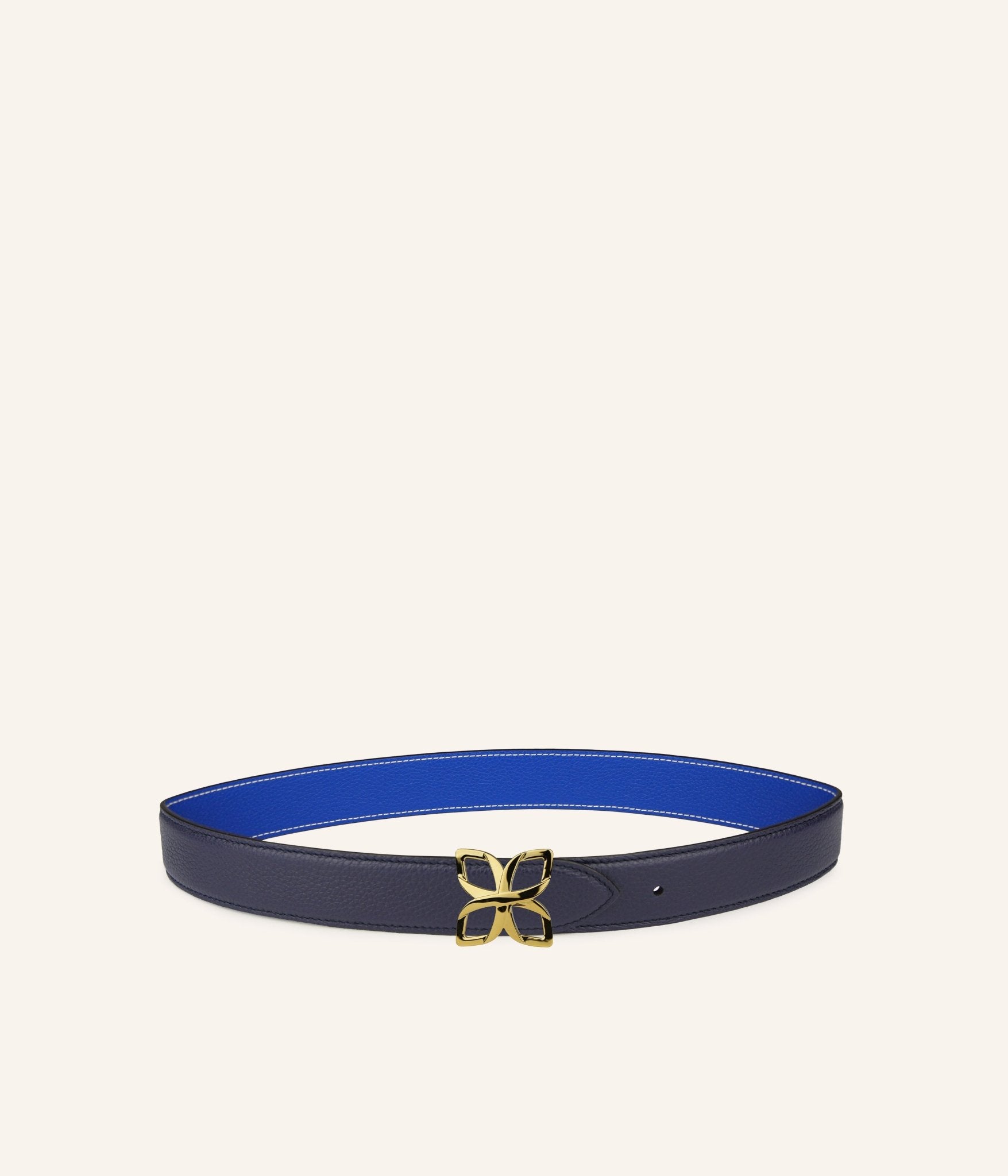 Audacieux et élégant, le cuir Bleu Marine réversible en Bleu Cobalt insuffle une énergie nouvelle à la Ceinture Hortensia Doré. Ce duo de bleus, entre sobriété classique et intensité moderne, permet de moduler votre allure au gré des envies.