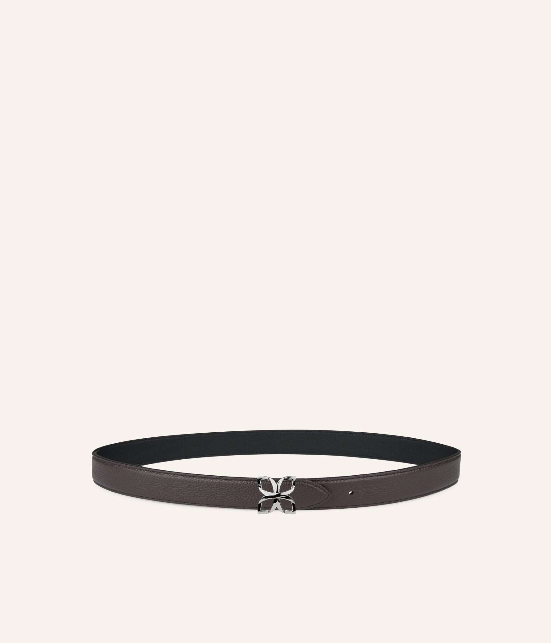 Élégante et discrètement contrastée, la Ceinture Hortensia Argentée 25 mm associe un cuir grainé Espresso à une face réversible en cuir lisse Noir, dans une version affinée pensée pour sublimer la silhouette avec équilibre. La profondeur du brun dialogue avec la sobriété du noir pour une allure sobre et affirmée.