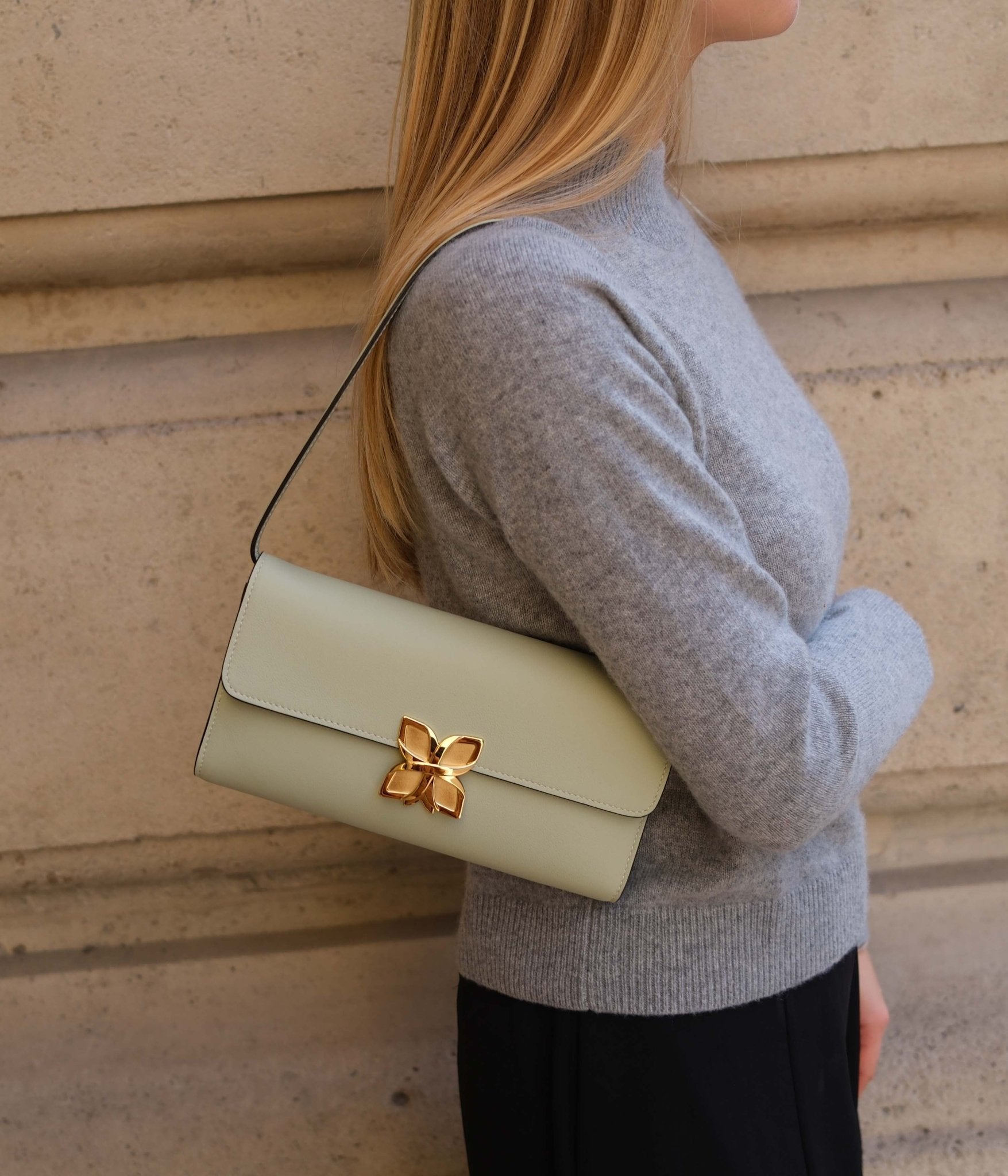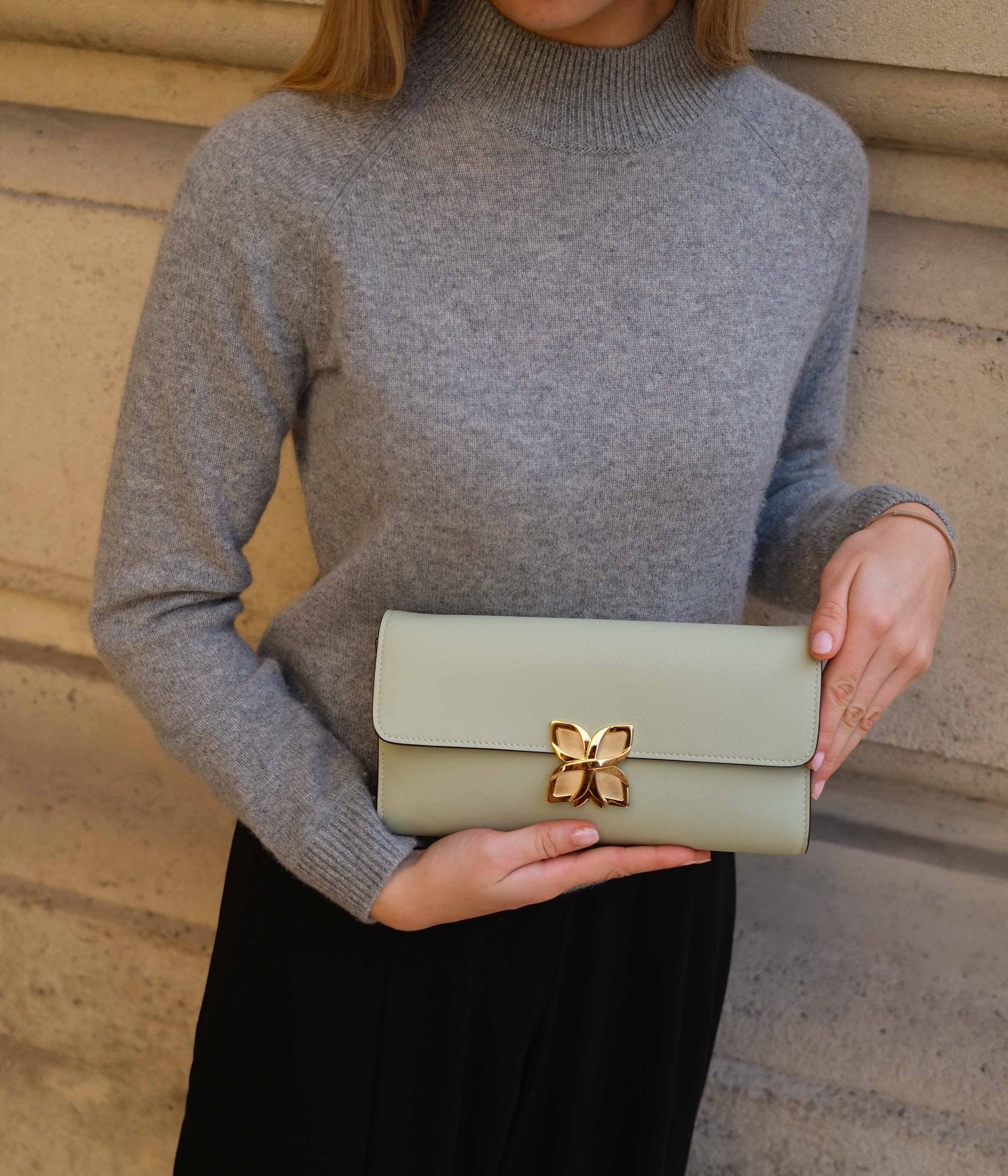 Laissez-vous inspirer par la fraîcheur du Hortensia Clutch en cuir de veau lisse Vert d’Eau. Fabriqué avec soin en Italie, ce modèle réinterprète l’iconique sac Hortensia dans un format épuré, à la fois délicat et contemporain.