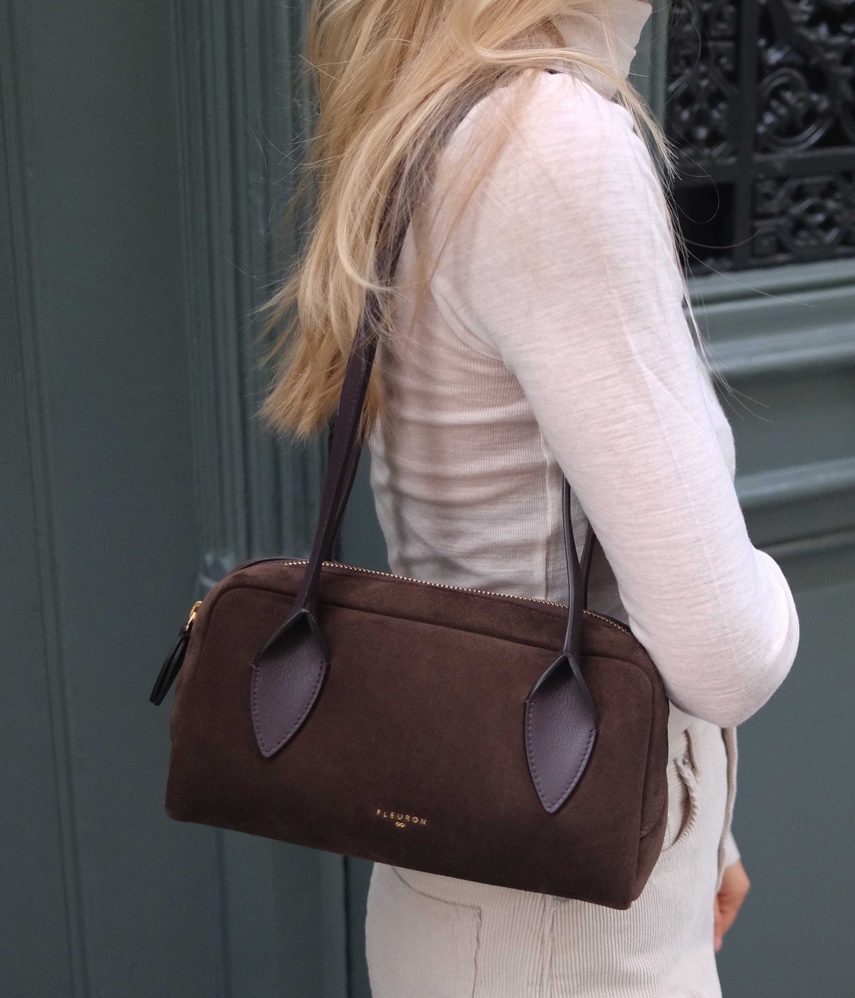 Le Mini Bambou en Suède de veau Figue, imaginé à Paris et façonné à la main dans notre atelier italien, séduit par son intensité et sa chaleur. Son cuir suédé, doux et délicat au toucher, met en valeur la profondeur de la teinte Figue, à la fois enveloppante et élégante. Cette couleur s’harmonise aussi bien avec des tons neutres qu’avec des nuances plus contrastées, apportant une note assurée à chaque tenue.