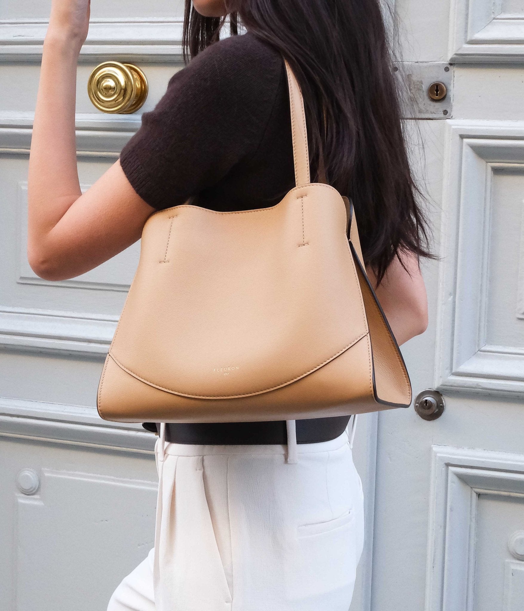 Le Mini Oak en cuir de veau lisse Cookie charme par sa teinte douce et lumineuse et son format compact au design épuré. Sa silhouette structurée offre l’espace idéal pour vos essentiels tout en ajoutant une touche chaleureuse et raffinée à vos tenues.