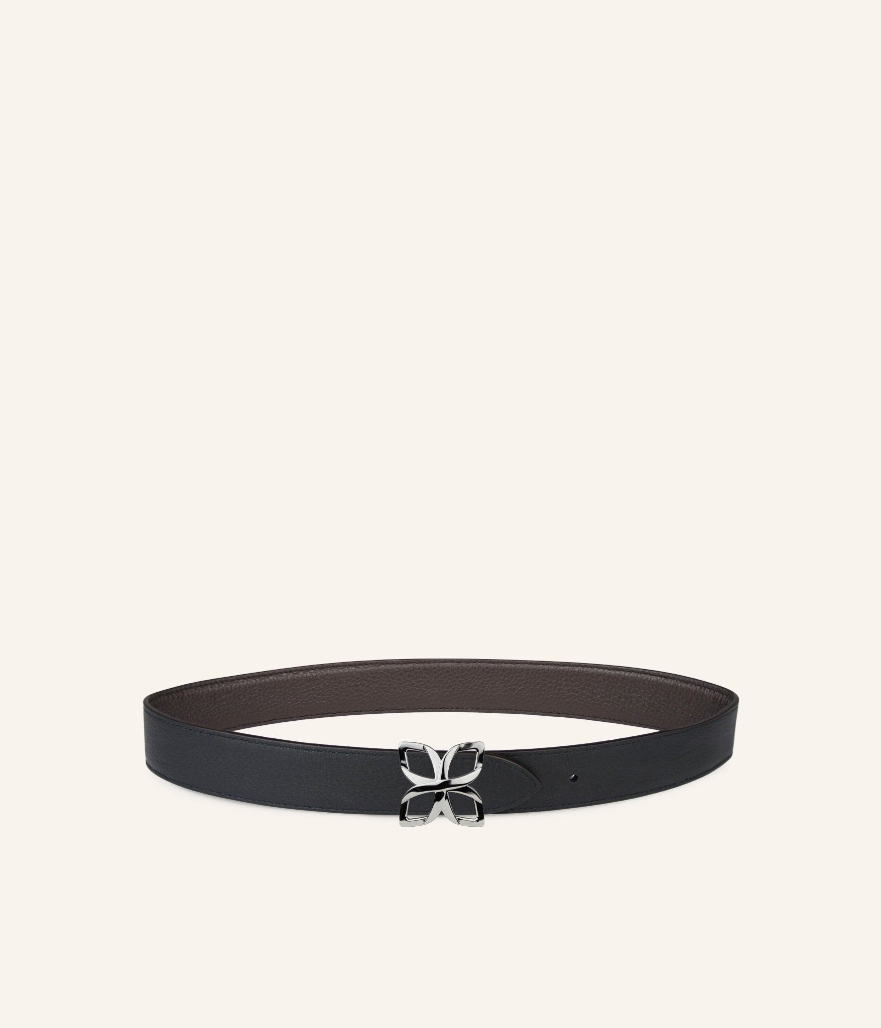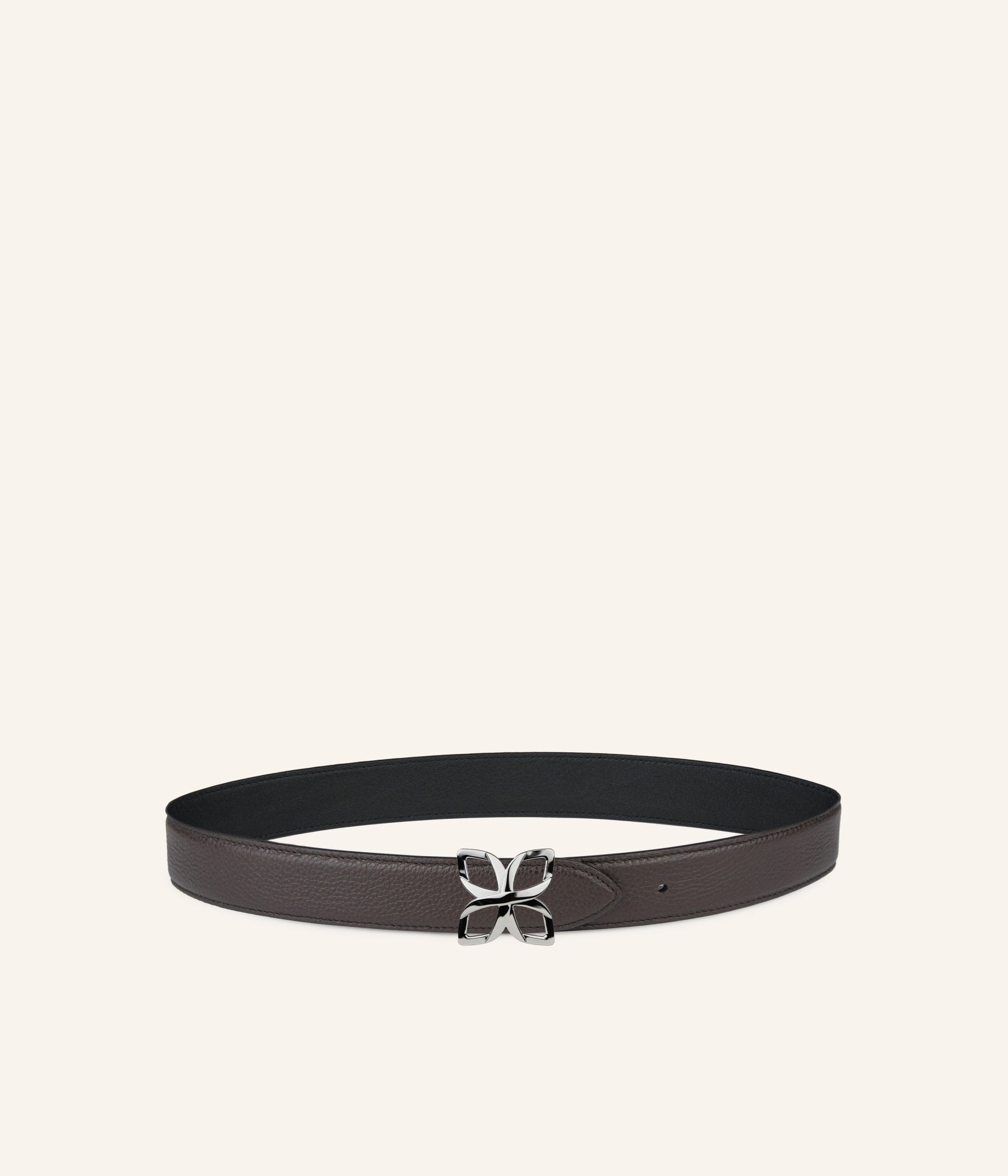 Avec son cuir de veau grainé Espresso réversible en Noir lisse, la Ceinture Hortensia Argentée explore les contrastes avec sobriété et caractère. La profondeur du brun dialogue avec l’élégance discrète du noir pour une silhouette tout en maîtrise.
