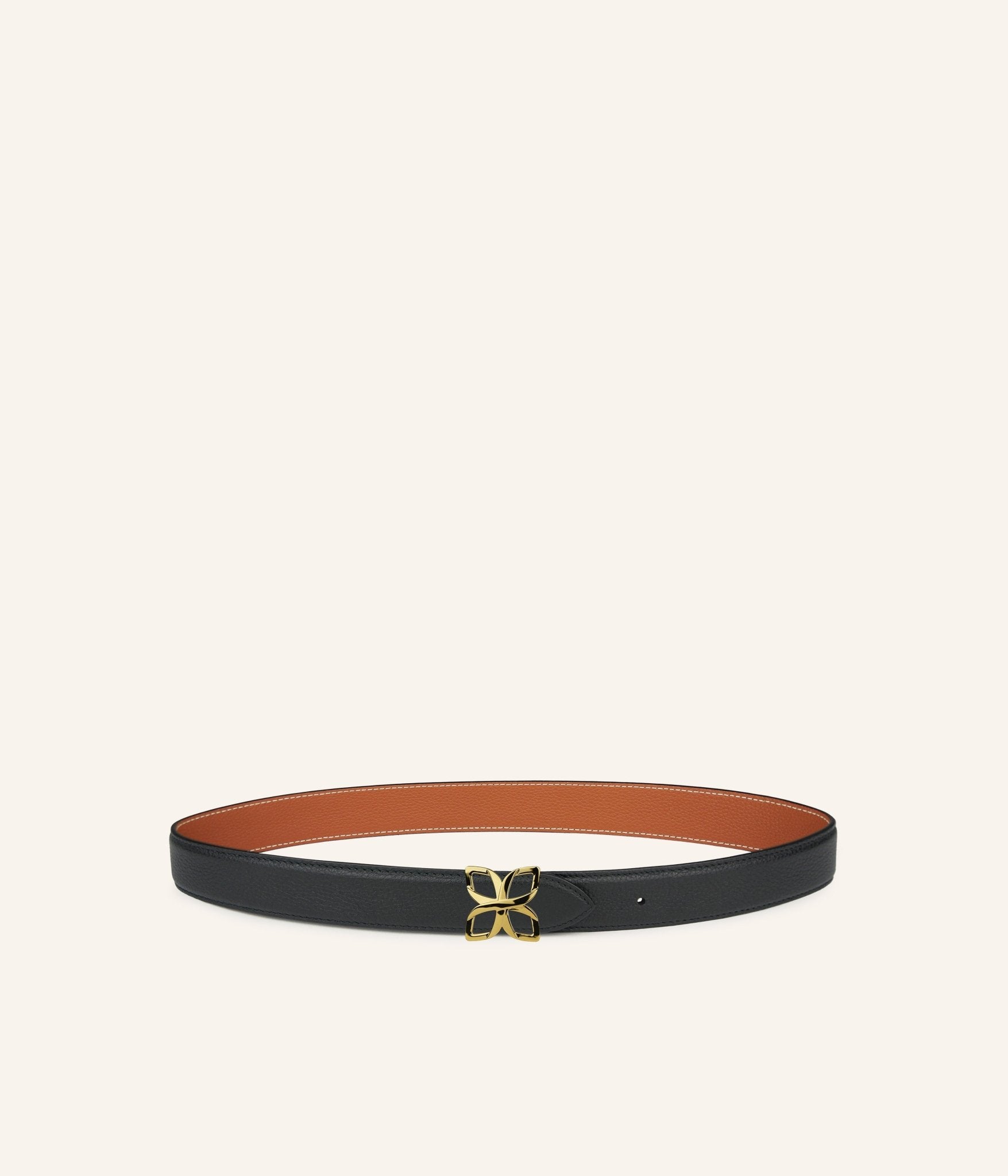 Avec son cuir de veau grainé Noir réversible Caramel, la Ceinture Hortensia Doré 25 mm offre une version plus fine et délicate d’un classique intemporel. Ce noir profond, à la fois sobre et affirmé, se retourne en un caramel chaud et enveloppant, pour varier les styles avec élégance.