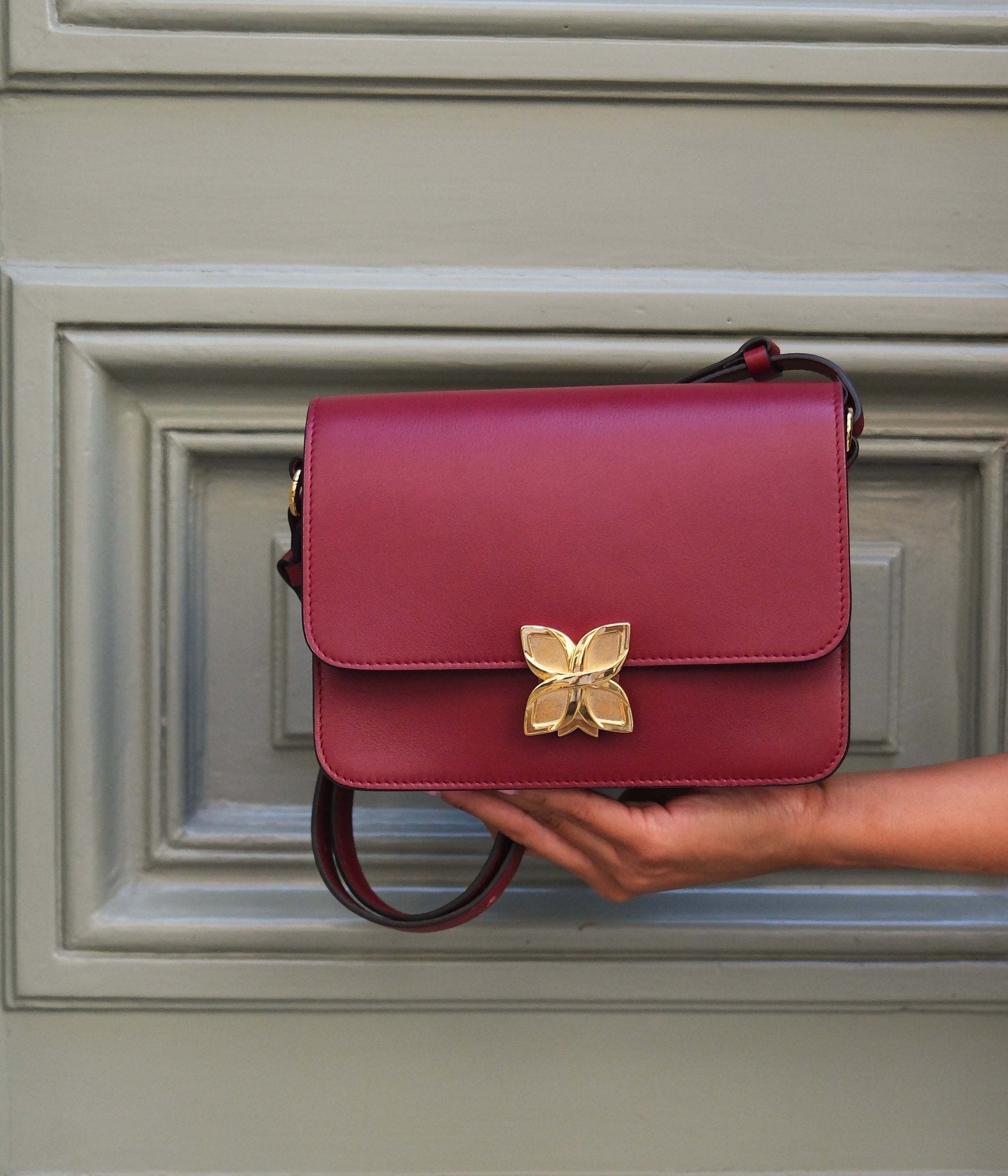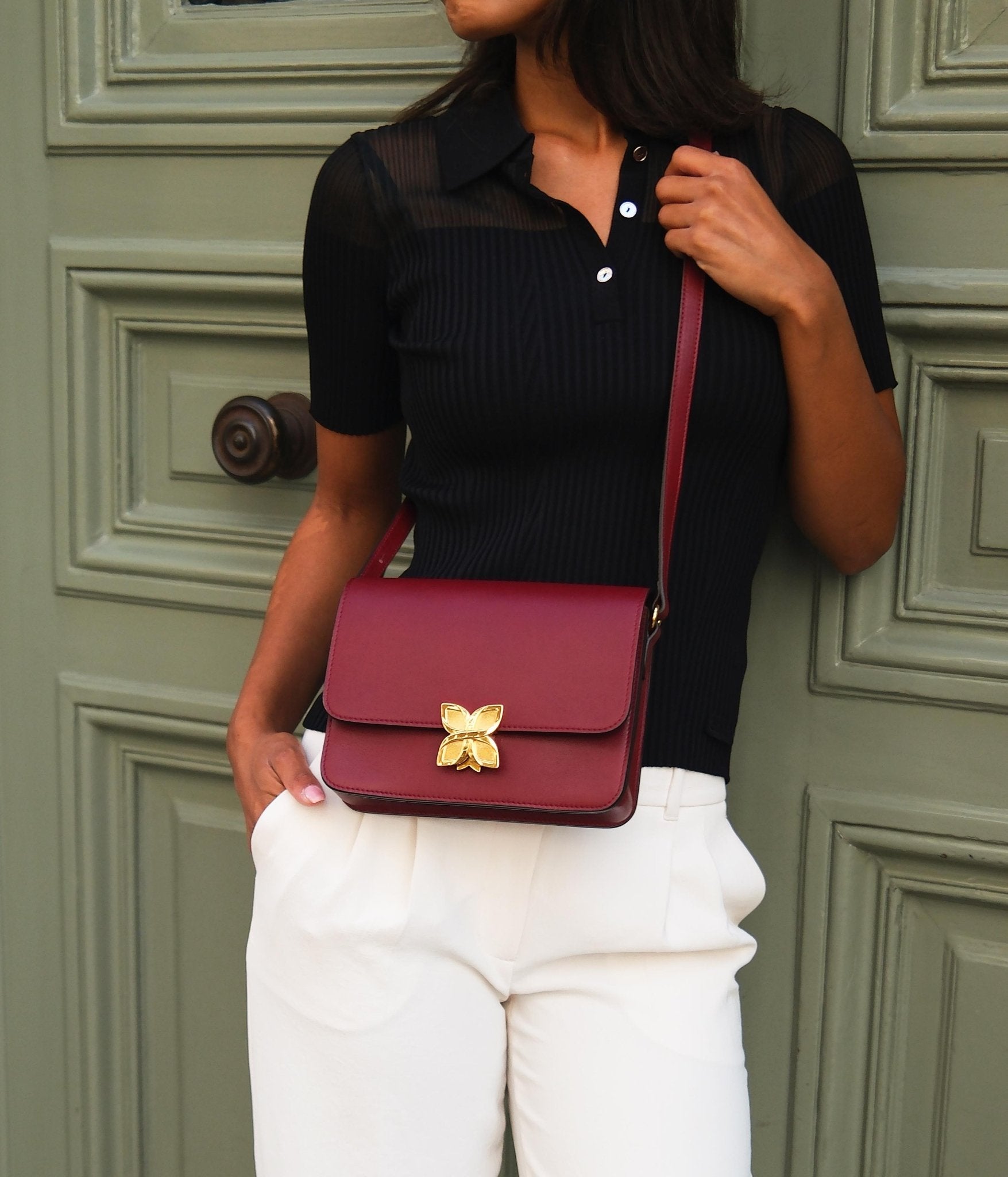 Pour un look à la fois chaleureux et audacieux, associez le sac Hortensia Cerise à des nuances dorées ou cuivrées, qui soulignent la richesse de sa couleur. Il se marie aussi parfaitement à une palette de tons bruns, camel ou vert profond, pour créer un contraste subtil et un ensemble élégant en toute saison.