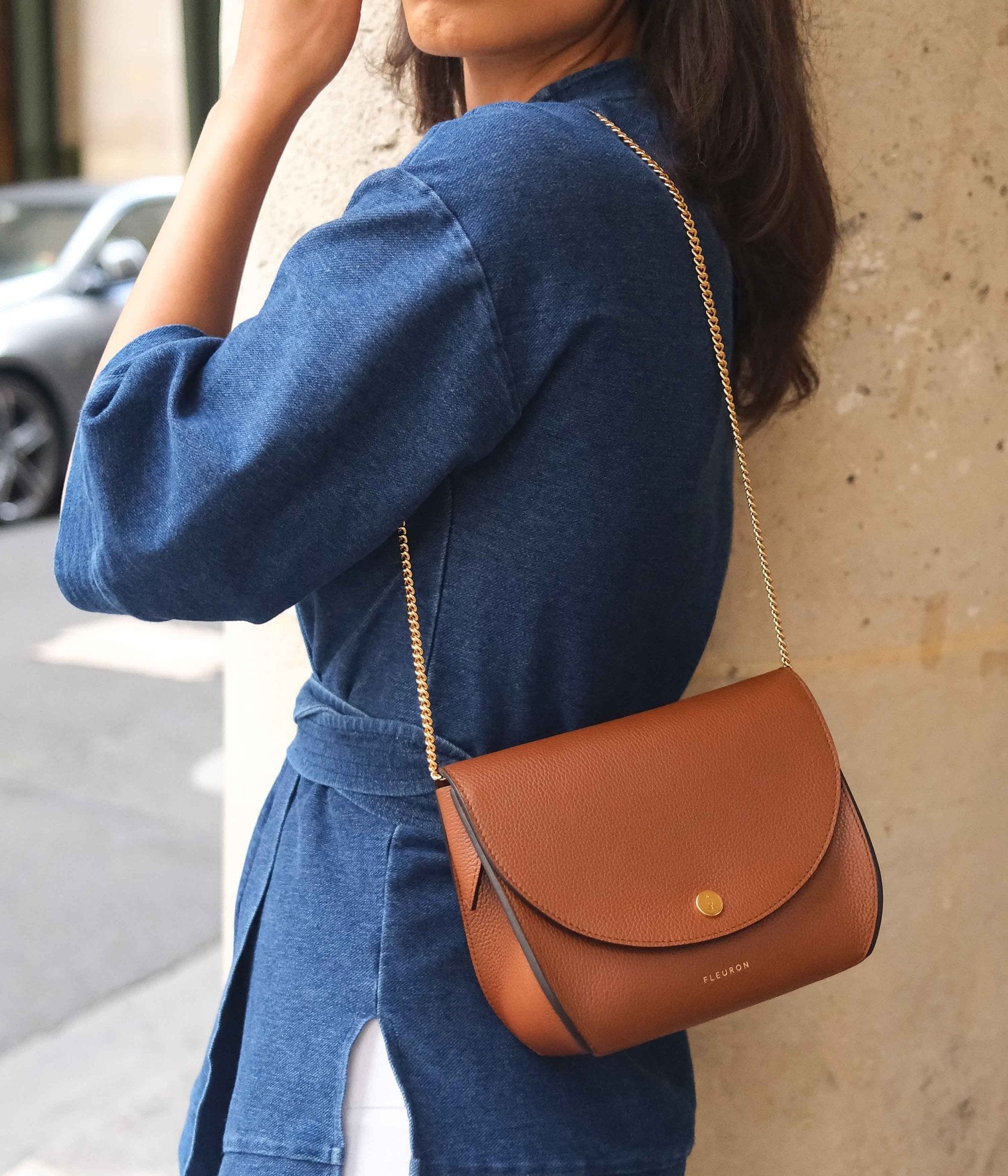 Made from carefully selected grained calf leather, it stands out for its elegant texture and durability. Discreet gold-tone hardware enhances the warmth of the brown, which pairs beautifully with soft tones like blush beige, cream, or linen for a harmonious look. For a bolder contrast, style it with deep hues like navy blue, forest green, or burgundy to highlight the richness of the color.