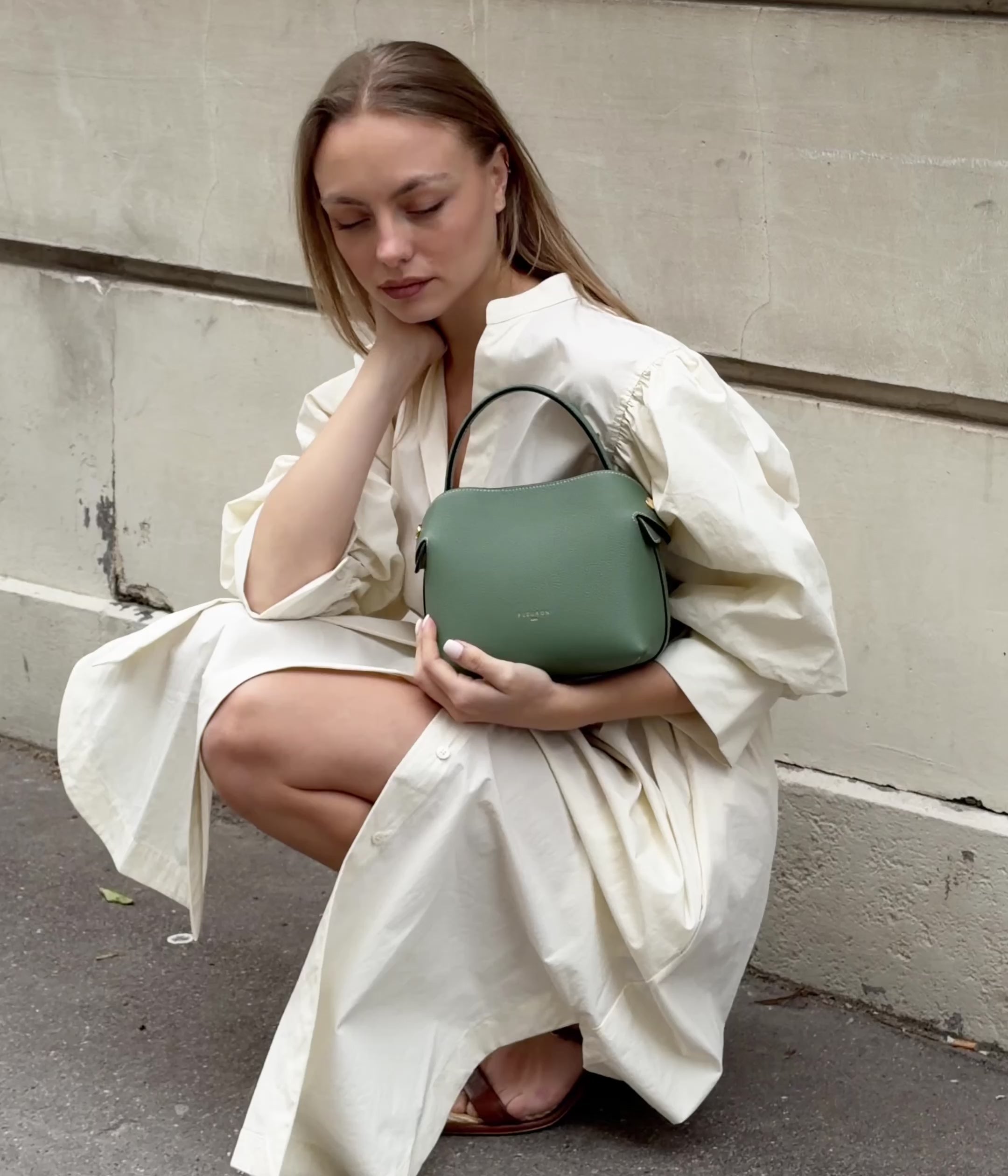 A supple silhouette, an elegant touch with its top handle, the sides fold and unfold like the beating of a wing, for an airy look. The Swann, available in a mini format, has an elongated shoulder strap that leaves your hands free. Be in harmony with nature with our Fleuron bag in almond green color. This soft and relaxing shade is perfect for those looking to add a touch of tranquility to their wardrobe. Made in Italy with grained calf leather, this bag features a beige interior and golden details.