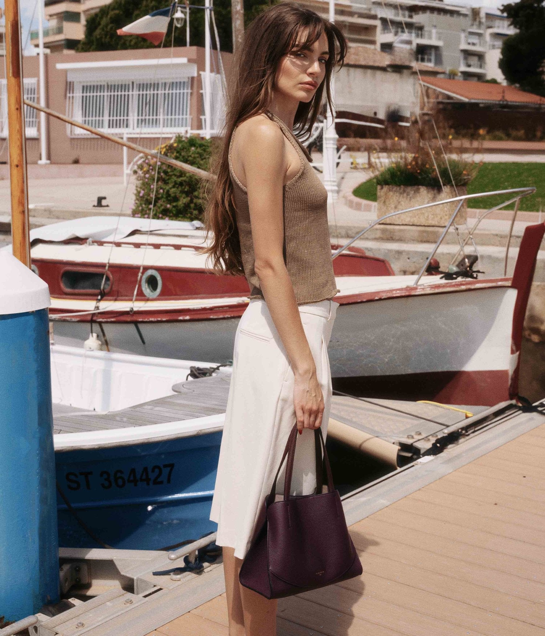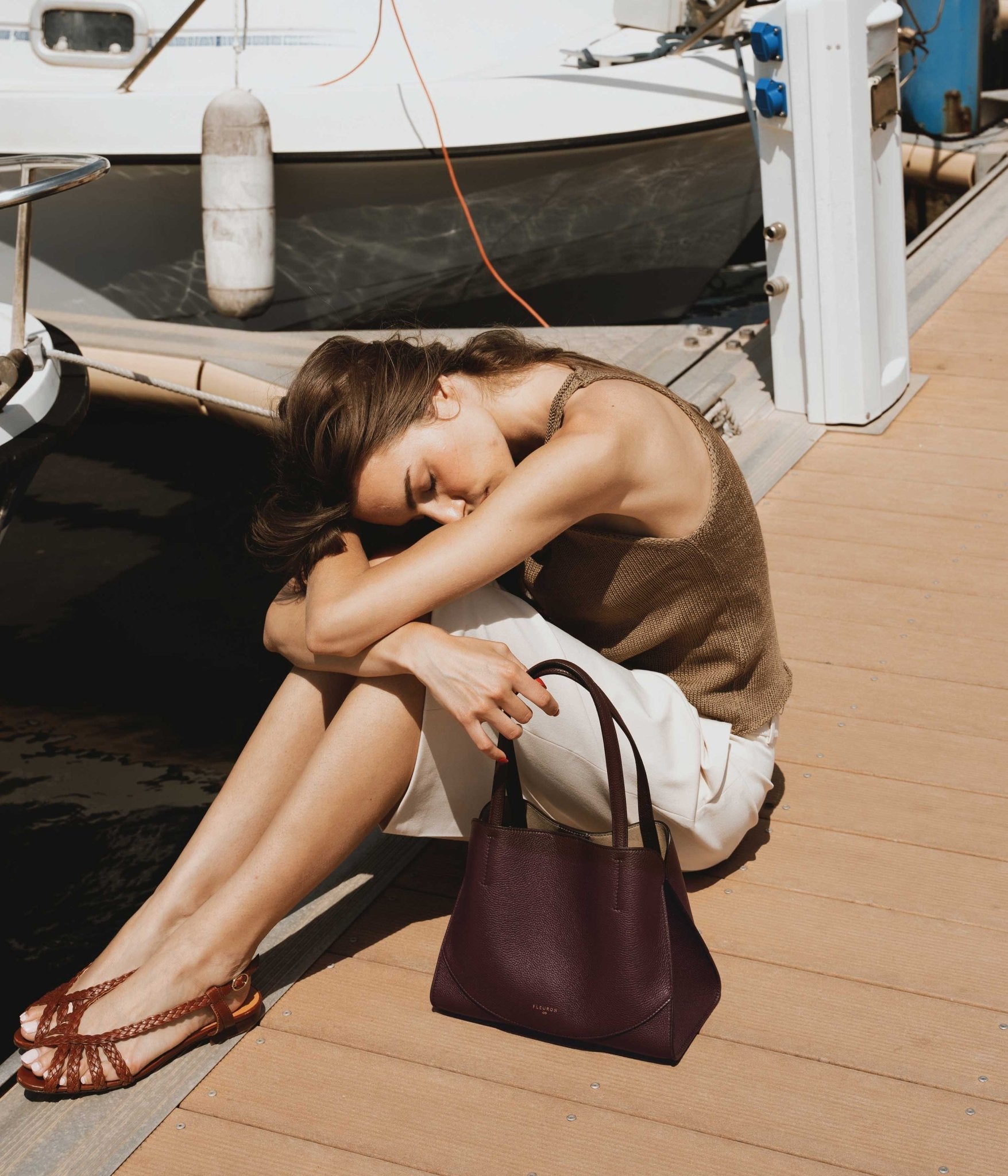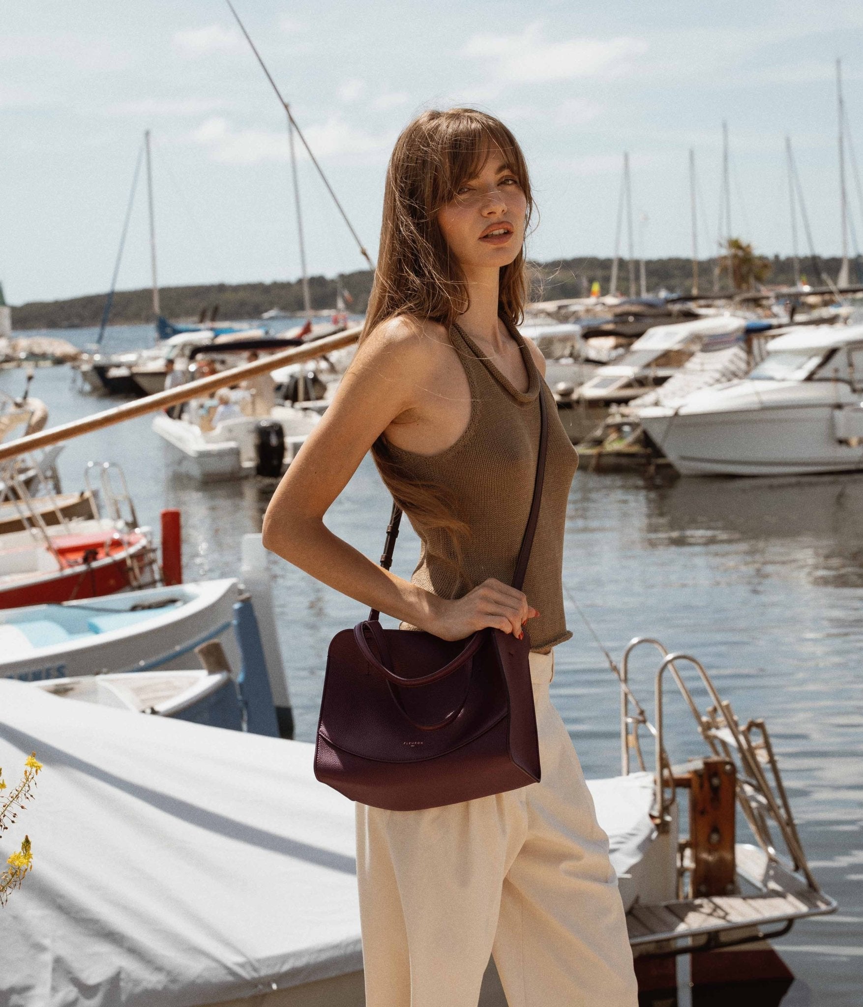 The Mini Oak in grained calf leather Prune embodies contemporary elegance in a compact, structured format designed to keep up with your day. Despite its sleek silhouette, it offers generous space, enough to carry a notebook or tablet, blending practicality with refined style.