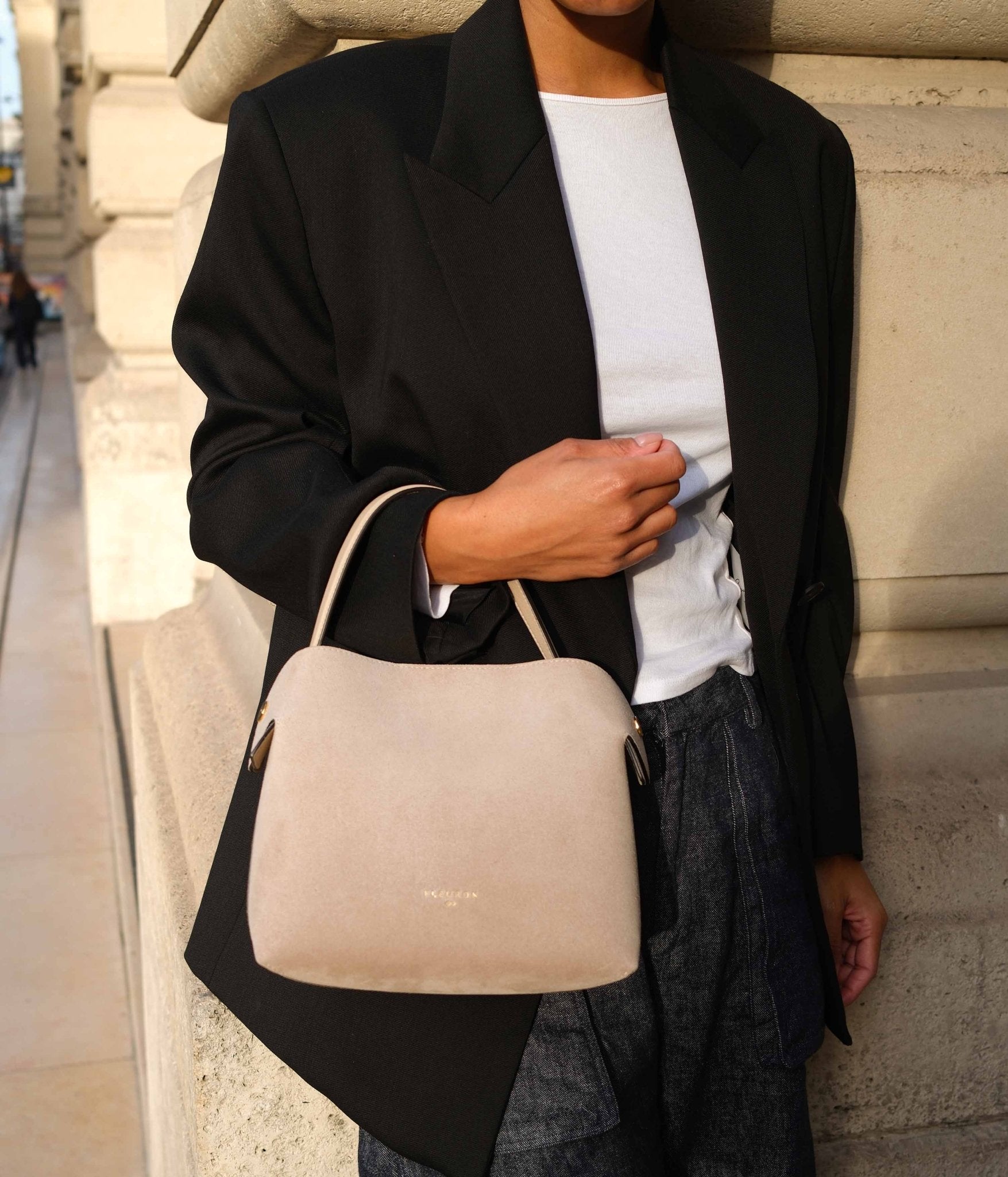 The Medium Swann in Calf Suede Dune, designed in Paris and handcrafted in Italy, charms with its natural and luminous elegance. Its Dune shade, reminiscent of sand, pairs effortlessly with light tones such as ivory or off-white, as well as deeper hues like navy, khaki, or chocolate for a modern, balanced style.