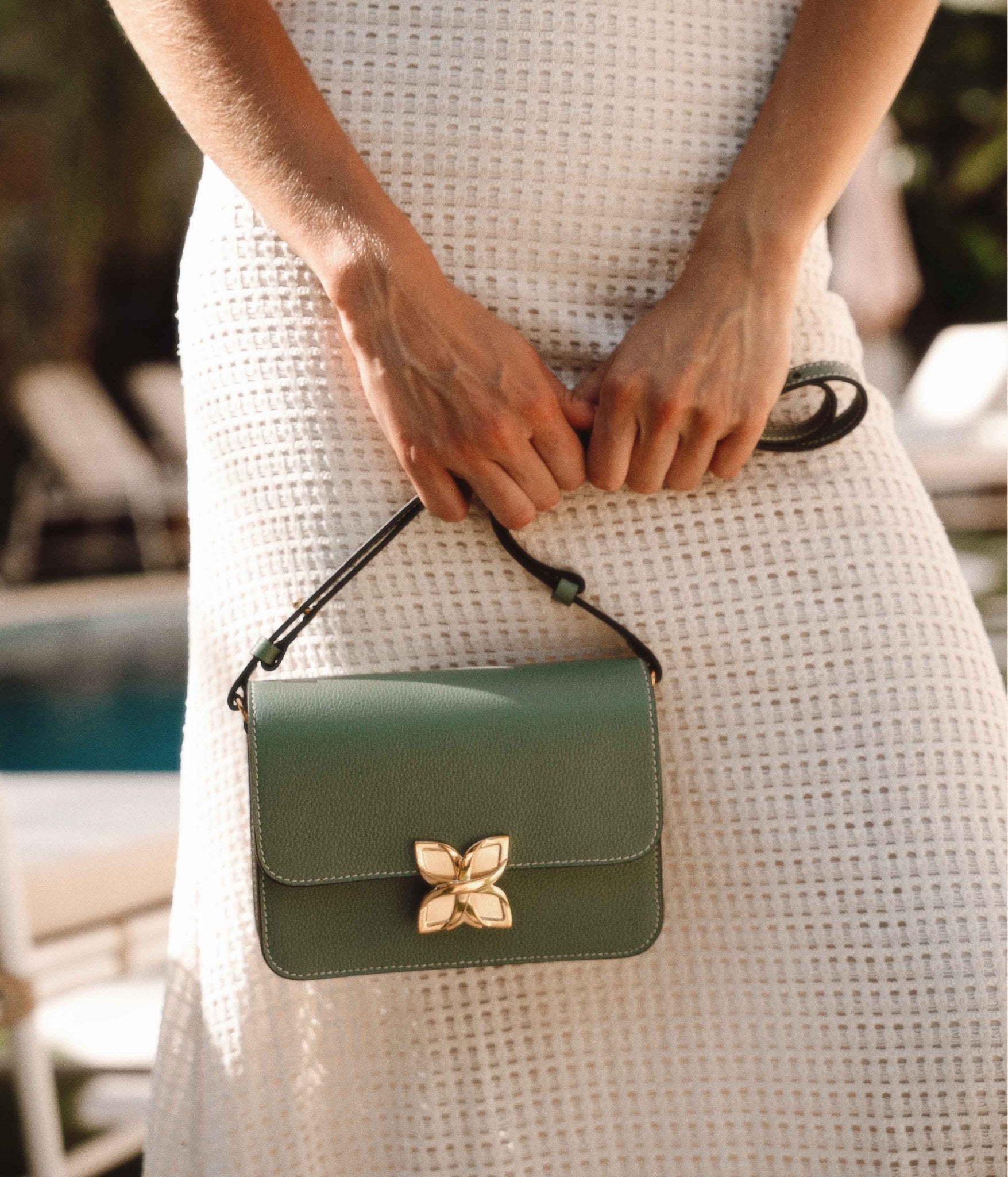Immerse yourself in the softness of the Almond Green Mini Hortensia, clad in finely grained calf leather that brings to mind the delicacy and fresh springtime of young leaves. Crafted with meticulous care in our Italian workshops, every aspect of this little gem of leatherwork celebrates the excellence of traditional craftsmanship enhanced with a touch of modernity.